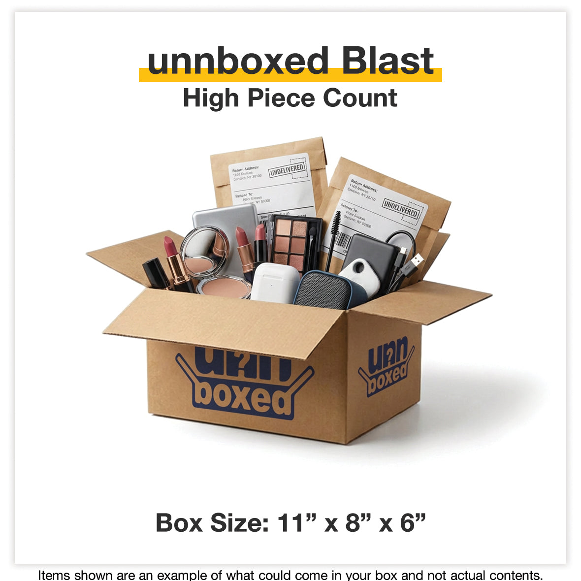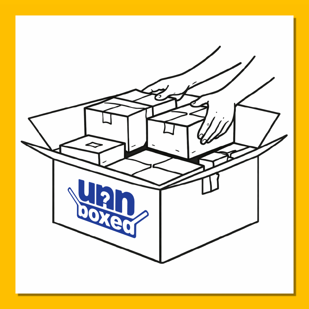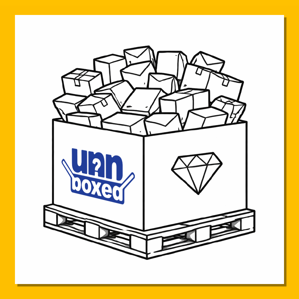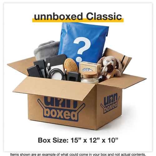 unnboxed mystery boxes are curated surprise boxes filled with a mix of undelivered mail, overstock items, and other suprises. Every box is different, and some boxes include our Blue Bag Bonus—our premium chase item sealed in a signature blue bag.